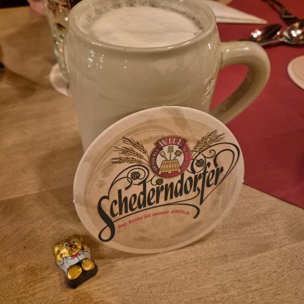 Nach dem Konzert haben wir den Abend in Schederndorf ausklingen lassen – bei gutem Bier und herzhaftem Juraessen. Zwischen fröhlichem Klirren der Gläser und deftigen Spezialitäten wurde noch viel gesungen, gelacht und die Stimmung des Tages lebendig gehalten. Ein würdiger Abschluss eines unvergesslichen Chorerlebnisses.