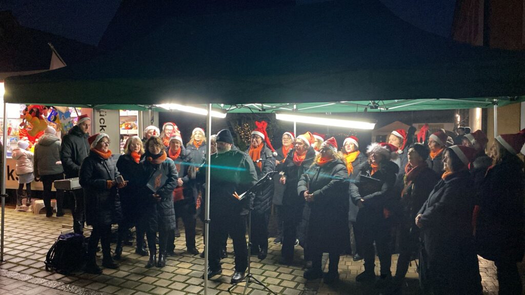 Wenige Tage später zeigte sich, dass Weihnachtsstimmung nicht zwingend trockenes Wetter braucht. Auf dem Weihnachtsmarkt in Scheßlitz trotzten wir tapfer den Regentropfen – und sangen einfach weiter. Die Gäste rückten unter Schirme, unter Kapuzn oder einfach zusammen, aber niemand ging weiter.
